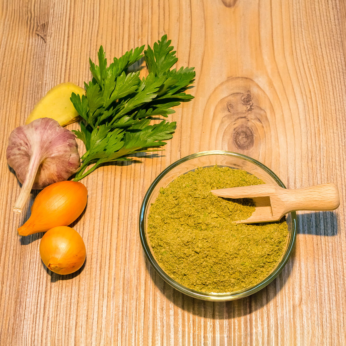 Skład: sól, gorczyca, wzmacniacz smaku (glutaminian monosodowy 10%), bazylia, imbir, pietruszka nać, oregano, czosnek, cebula, mięta.