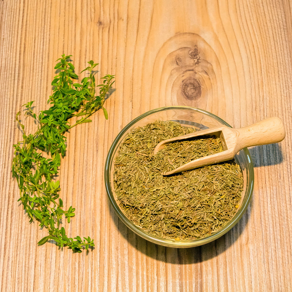 Tymianek to wspaniała przyprawa, która wyróżnia się ostrym i lekko pikantnym aromatem oraz smakiem. Tymianek dodaje wyrazistości każdej potrawie. Doskonale komponuje się z jagnięciną, cielęciną, ale także z drobiem czy rybami. Można dodać go do past, sałatek, zup oraz sosów, stanowi dobry dodatek do masła, chleba i warzyw.